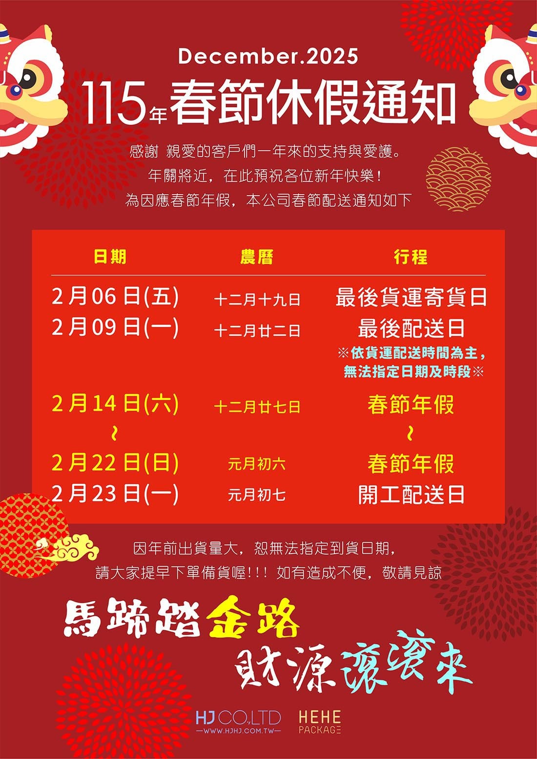 感謝 親愛的客戶們一年來的支持與愛護。 年關將近,在此預祝各位新年快樂!為因應春節年假,本公司春節配送通知如下