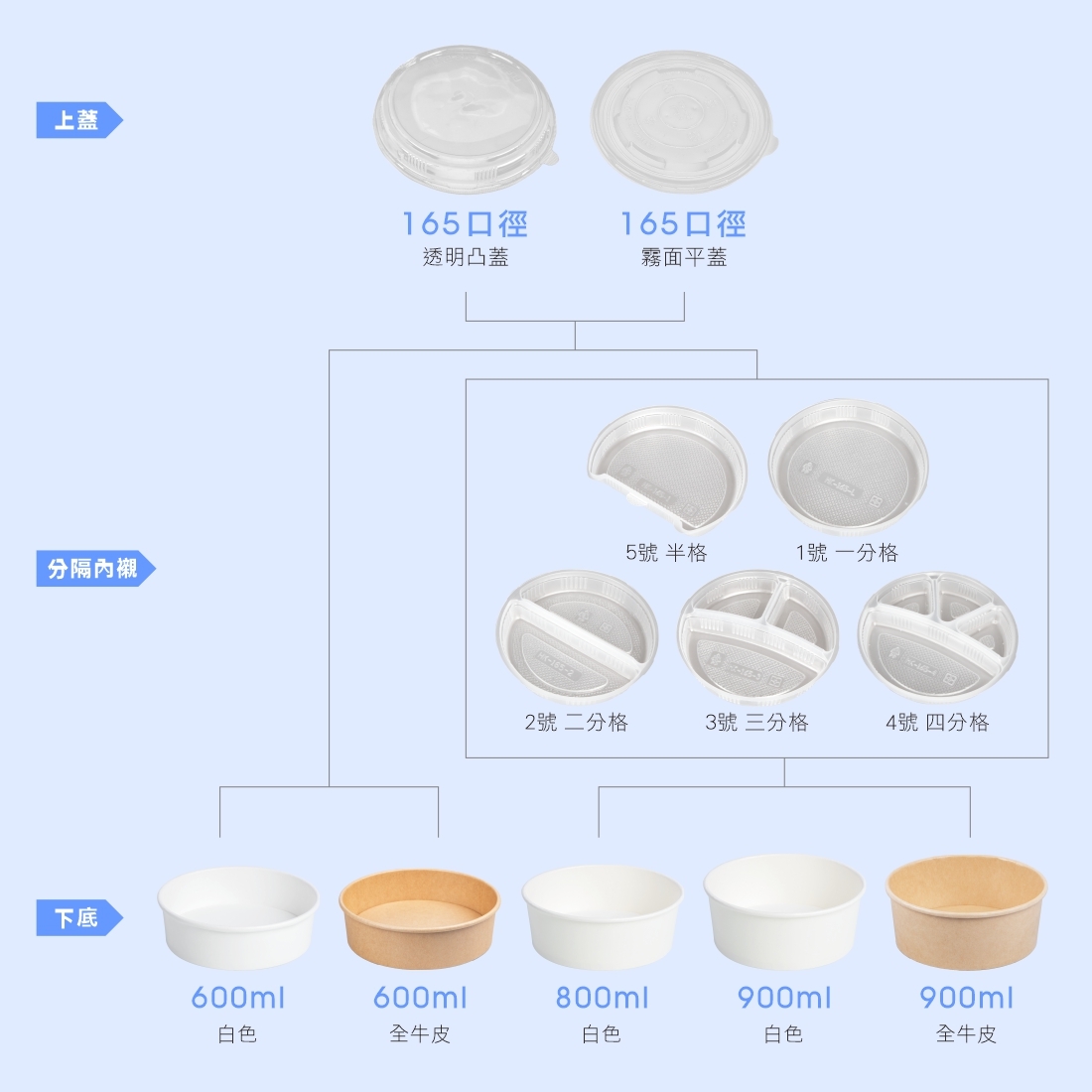 搭配:蓋 - PP圓便當盒霧面平蓋 165口徑、OPS圓便當盒透明凸蓋 165口徑、塑膠分隔內襯、公版腰封 6.8x48 公分(需配165口徑平蓋)、公版腰封 6.8x50 公分(需配165口徑凸蓋)