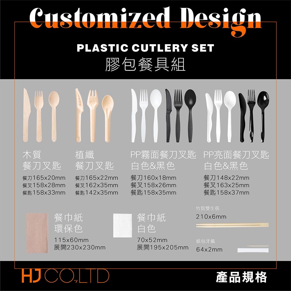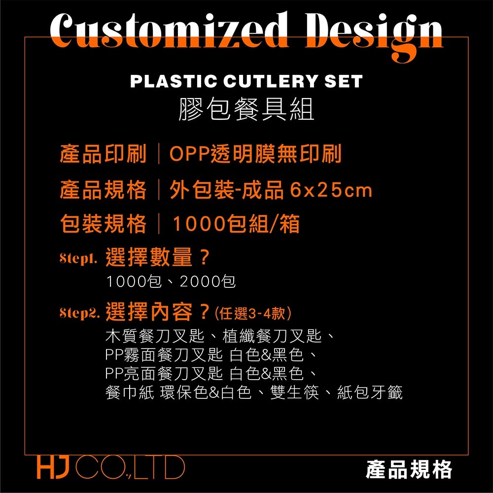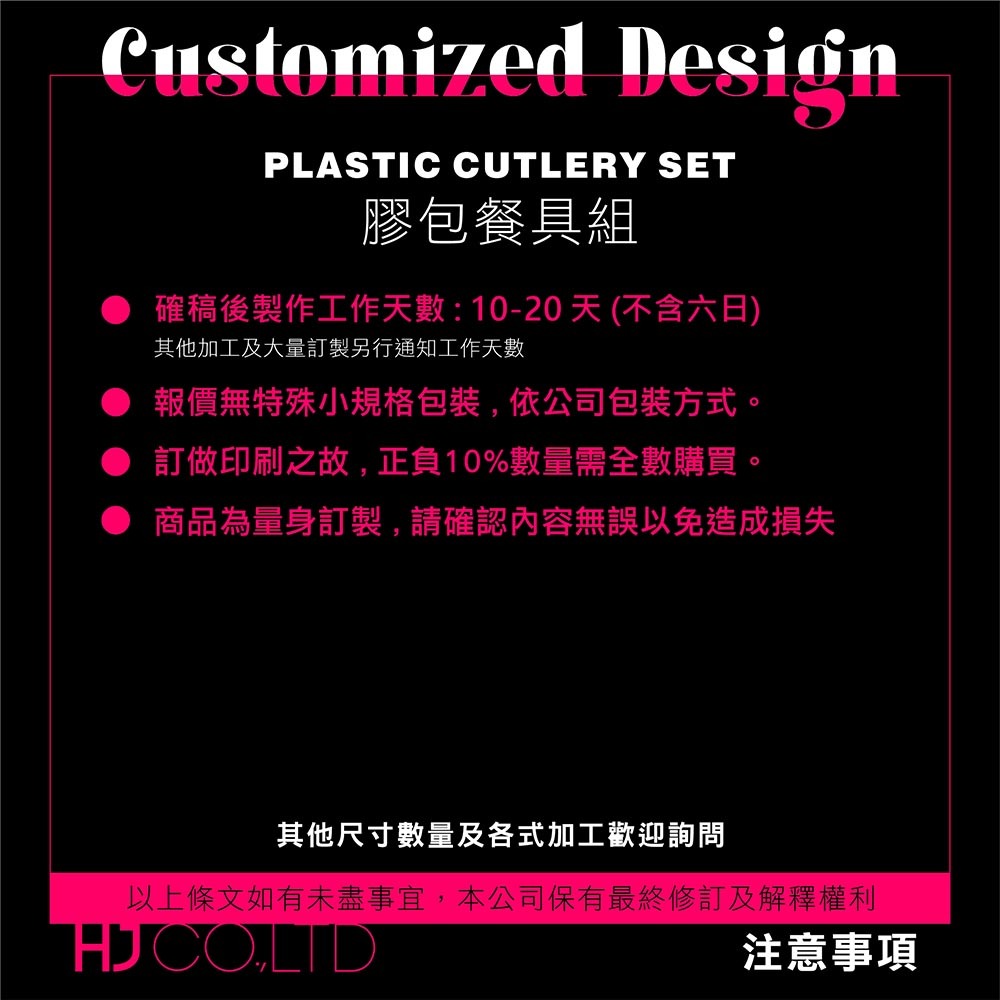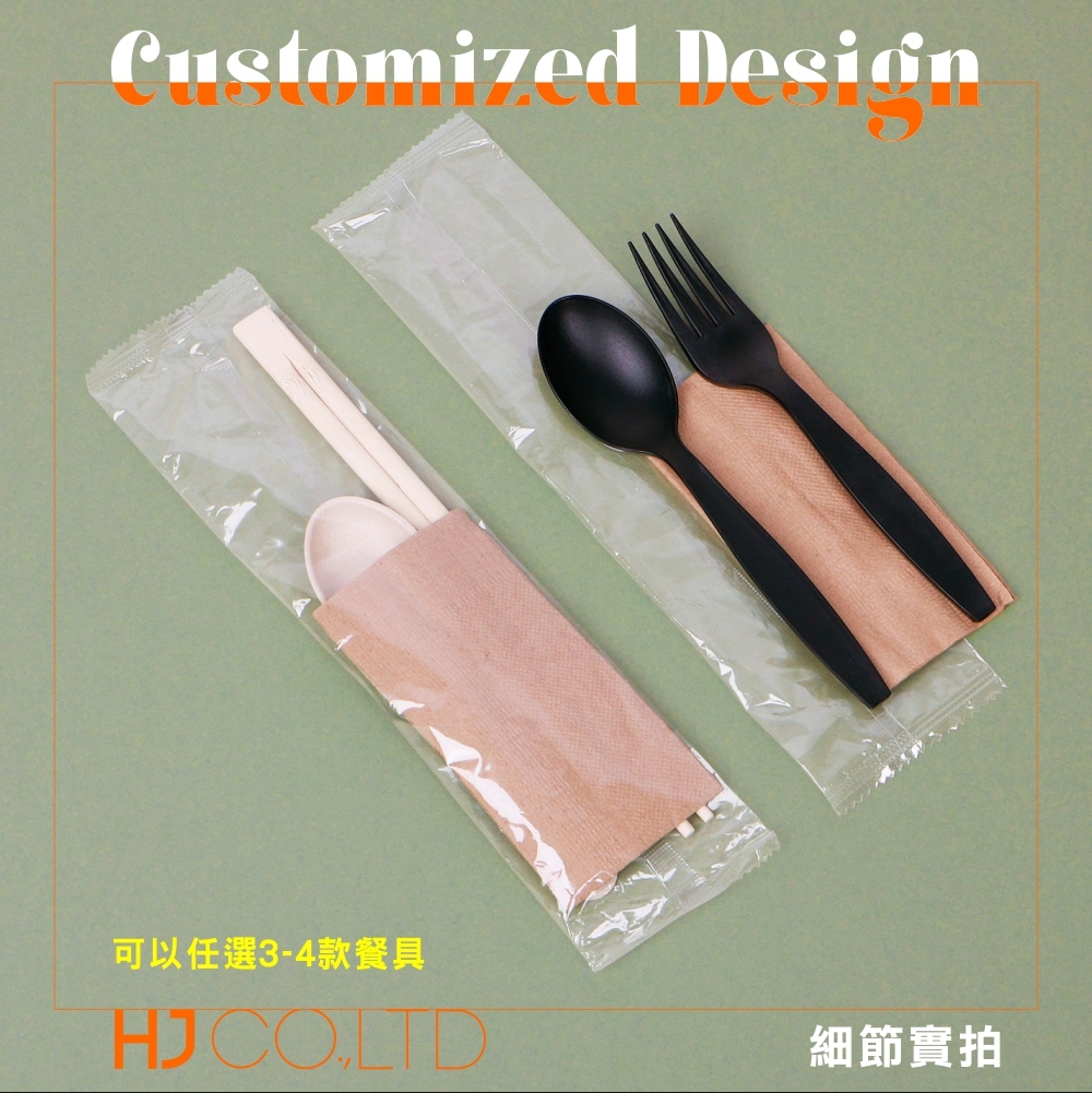 少量客製不怕囤~1000個起印~ 每套餐具採用透明OPP膜包裝,有效防止污染和碎屑,確保儲存期間的衛生。一次性設計讓您無需每次使用後都費心收集餐具,清潔起來輕鬆便捷。