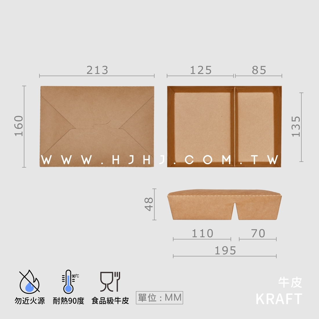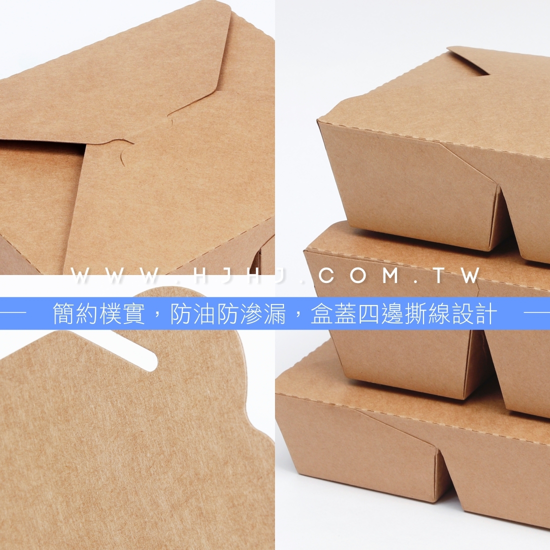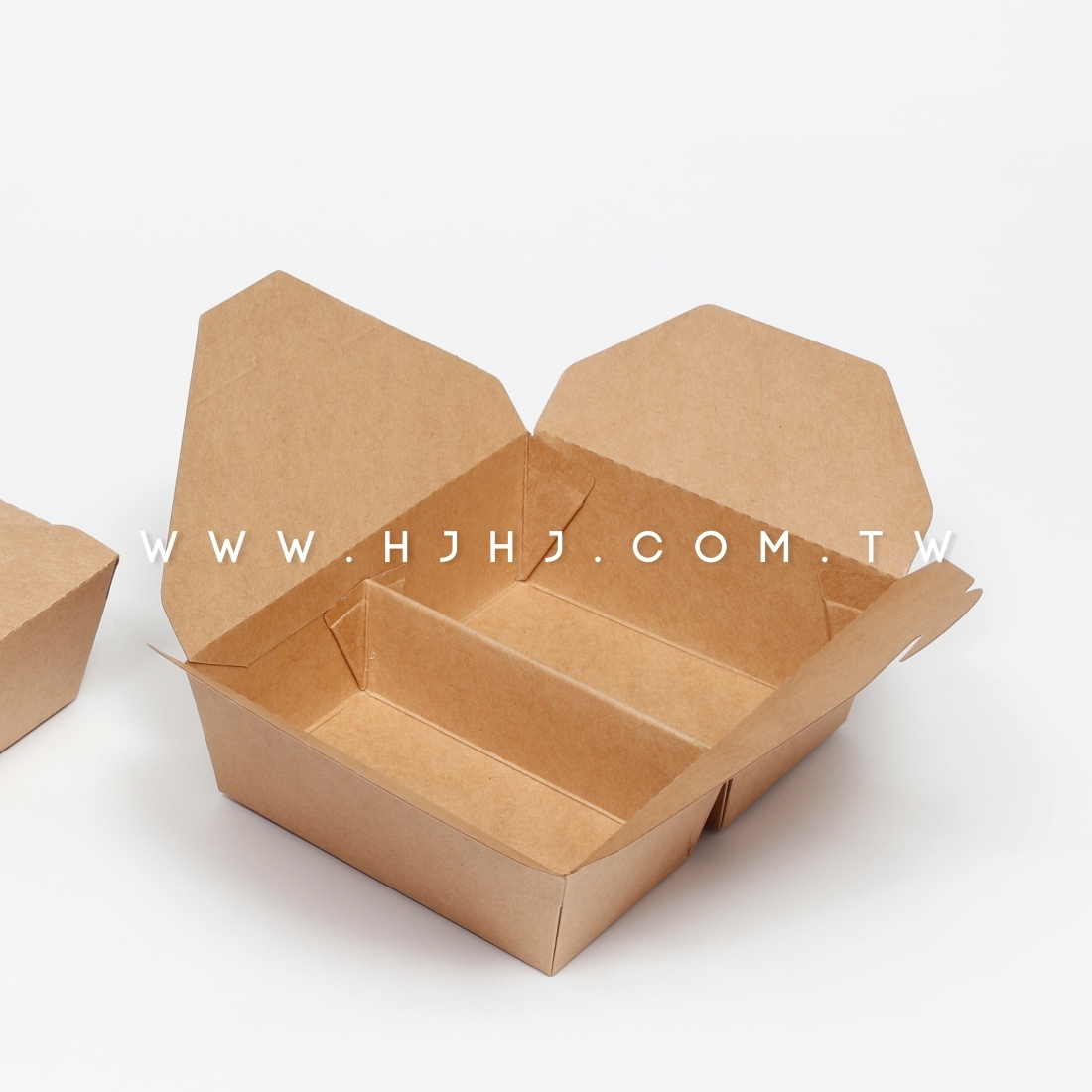 簡約樸實的牛皮紙方形餐盒,融入各式餐點,更能凸顯食物的美味內襯分隔設計,乾溼分離,讓味道不混淆,品嘗美食更美味。