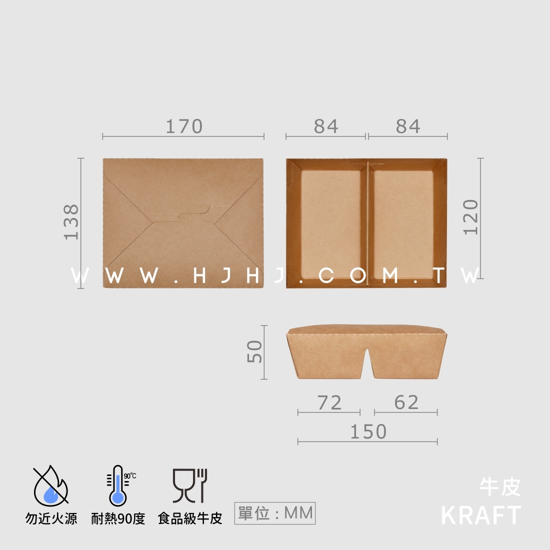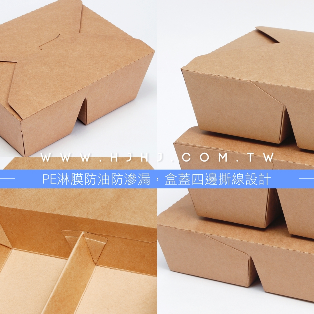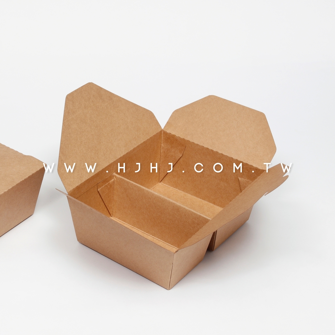 簡約樸實的牛皮紙方形餐盒,融入各式餐點,更能凸顯食物的美味內襯分隔設計,乾溼分離,讓味道不混淆,品嘗美食更美味。