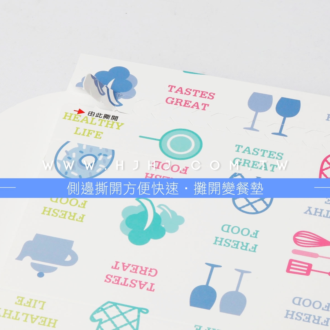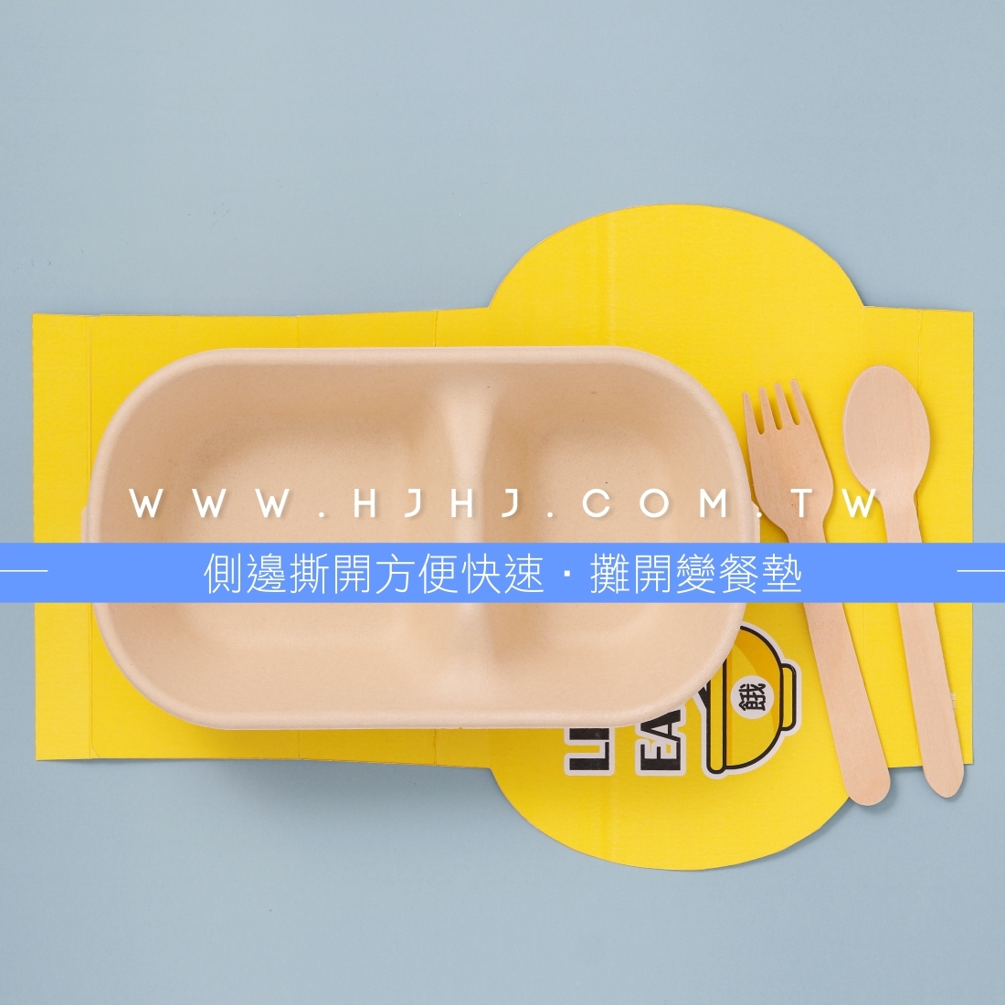 使用封套大大降低外帶意外開蓋,側邊撕開即可開蓋食用,將餐盒套攤開即為餐墊。