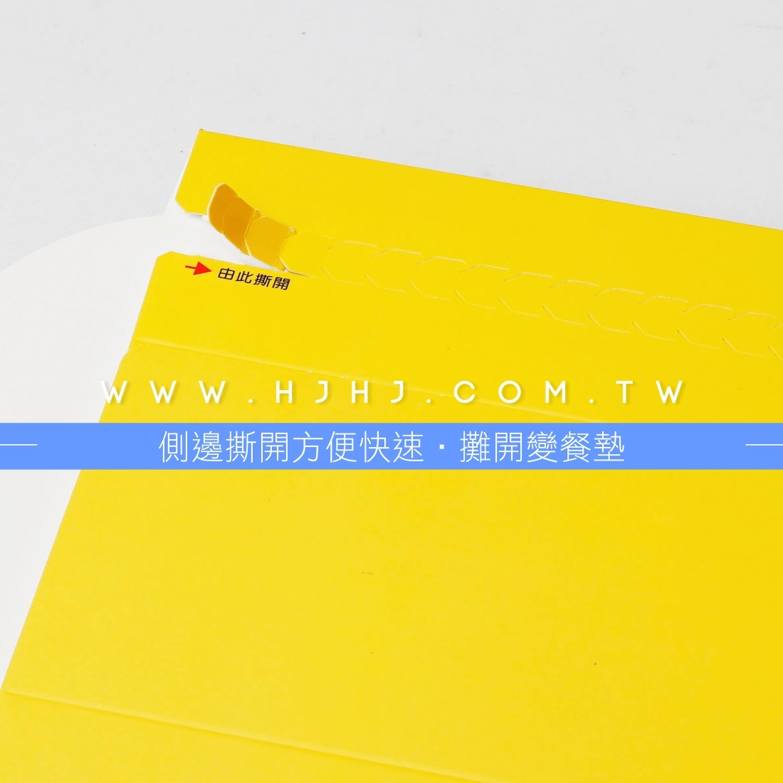 使用封套大大降低外帶意外開蓋,側邊撕開即可開蓋食用,將餐盒套攤開即為餐墊。