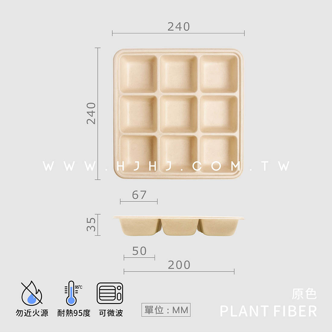 描述:九分格、耐熱5度~95度,防油防水無淋膜,可冷藏微波【因使用天然植物纖維製成,每批顏色不同屬正常現象】