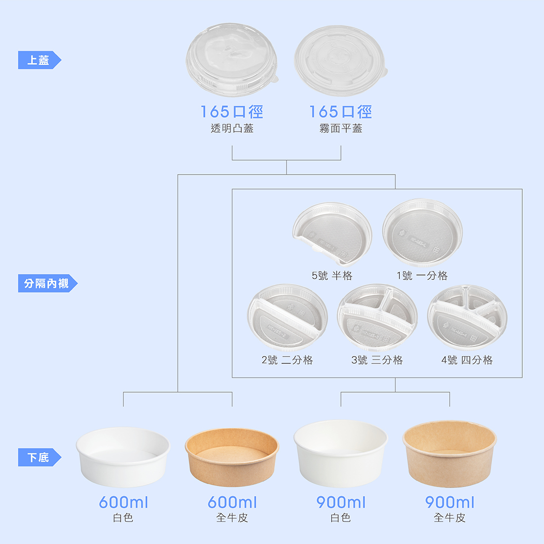 搭配:蓋 - PP圓便當盒霧面平蓋 165口徑、OPS圓便當盒透明凸蓋 165口徑、公版腰封 6.8x48 公分