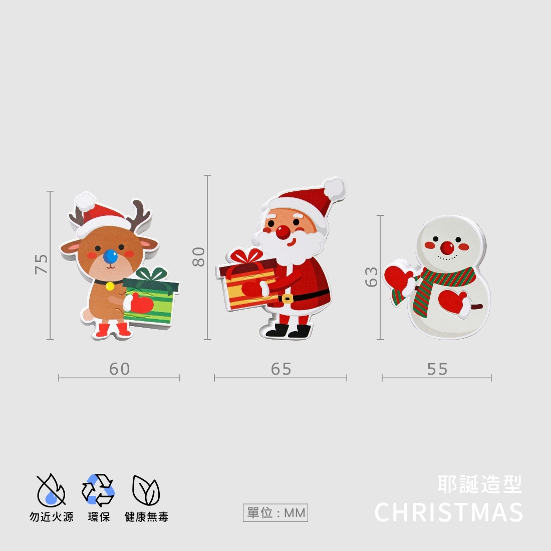尺寸:耶誕老人-71x77mm/雪寶-53x62mm/馴鹿-63x74mm